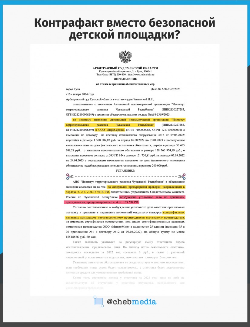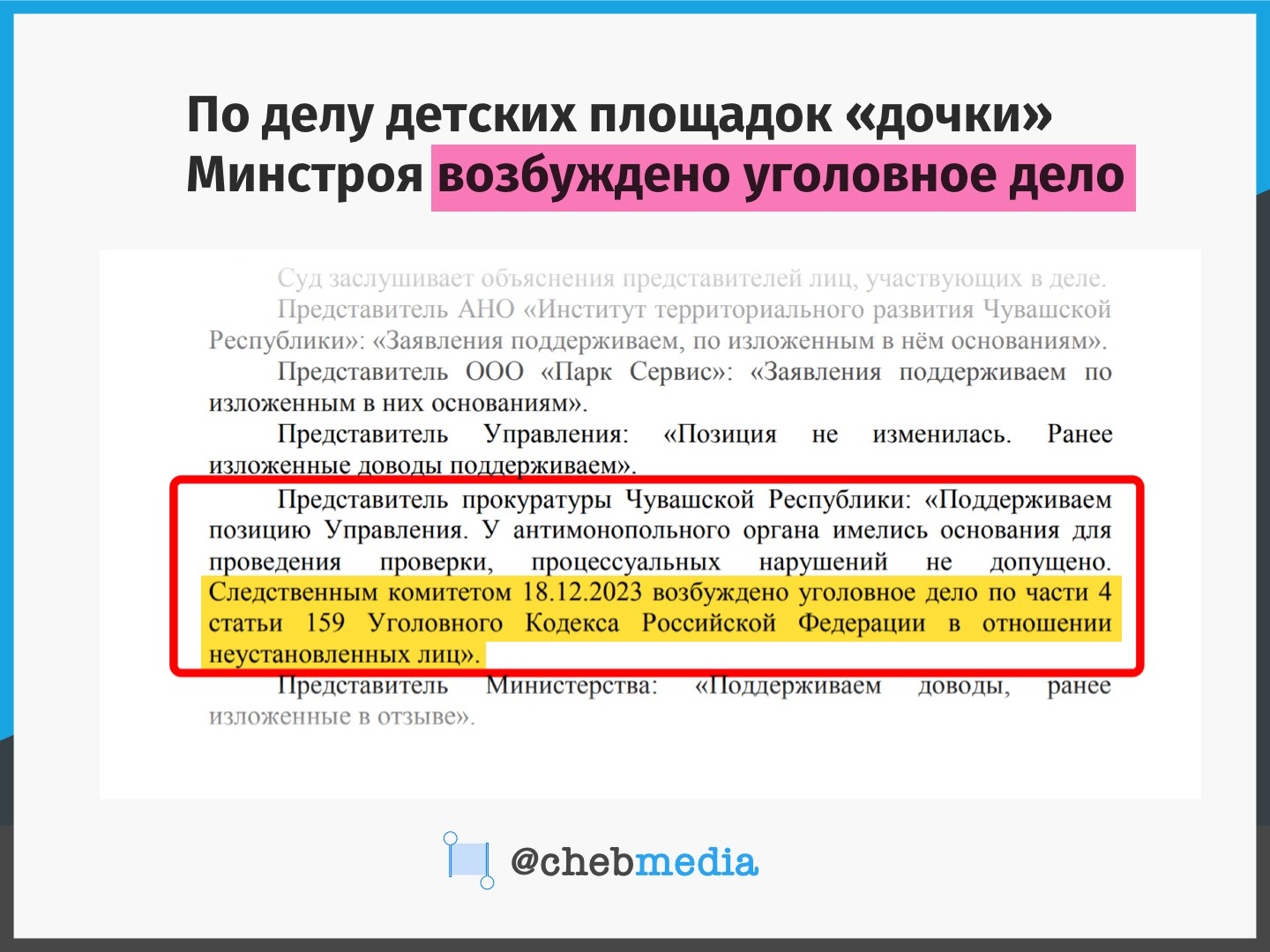 О возбуждении уголовного дела по детским площадкам от «аношки» Минстроя стало известно в конце прошлого года. Причем не от правоохранительных органов, а из протокола Арбитражного суда Чувашии. В нем говорилось, что «следственным комитетом 18.12.2023 возбуждено уголовное дело по части 4 статьи 159 Уголовного Кодекса Российской Федерации в отношении неустановленных лиц».