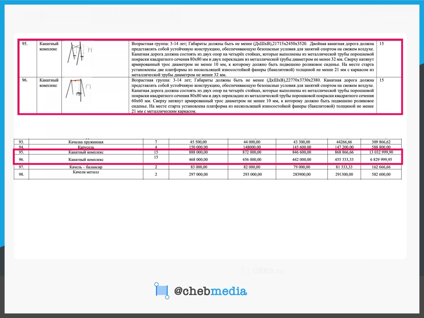 Речь идет о канатных комплексах на одну и две линии, каждый закупался по 15 штук. «Тарзанка» на одну линию стоила 468 тысяч рублей за штуку, а на две – 888 тысяч рублей. В Чебоксарах ее установили на 5 площадках, и лишь на двух она работала.